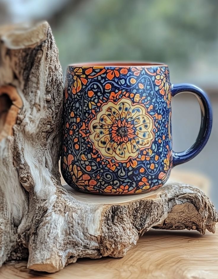 This hand‑painted ceramic mug is crafted in small batches by skilled artisans, using high‑quality clay that is shaped, fired, and glazed for strength and durability. The surface is then hand‑painted with carefully applied motifs, so no two pieces are exactly the same, giving each mug its own character and story. The form is designed for daily comfort, with a smooth lip, balanced weight, and easy‑grip handle that feels natural in the hand whether you are sipping morning chai, coffee, or herbal tea.​